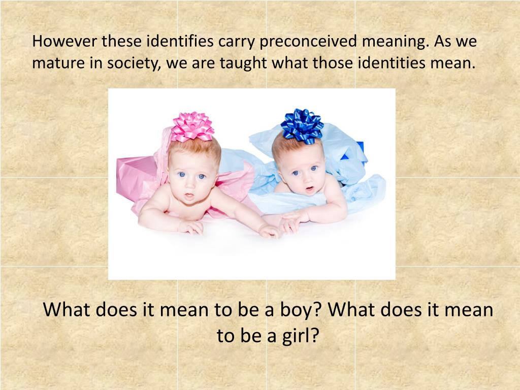 However these identifies carry preconceived meaning. As we mature in society, we are taught what those identities mean. What does it mean to be a boy? What does it mean to be a girl?