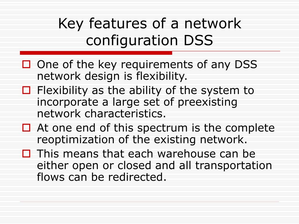 Key features of a network configuration DSS • One of the key requirements of any DSS network design is flexibility. • Flexibility as the ability of the system to incorporate a large set of preexisting network characteristics. • At one end of this spectrum is the complete reoptimization of the existing network. • This means that each warehouse can be either open or closed and all transportation flows can be redirected.