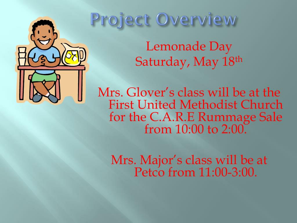 Project Overview Lemonade Day Saturday, May 18th Mrs. Glover’s class will be at the First United Methodist Church for the C.A.R.E Rummage Sale from 10:00 to 2:00. Mrs. Major’s class will be at Petco from 11:00-3:00.