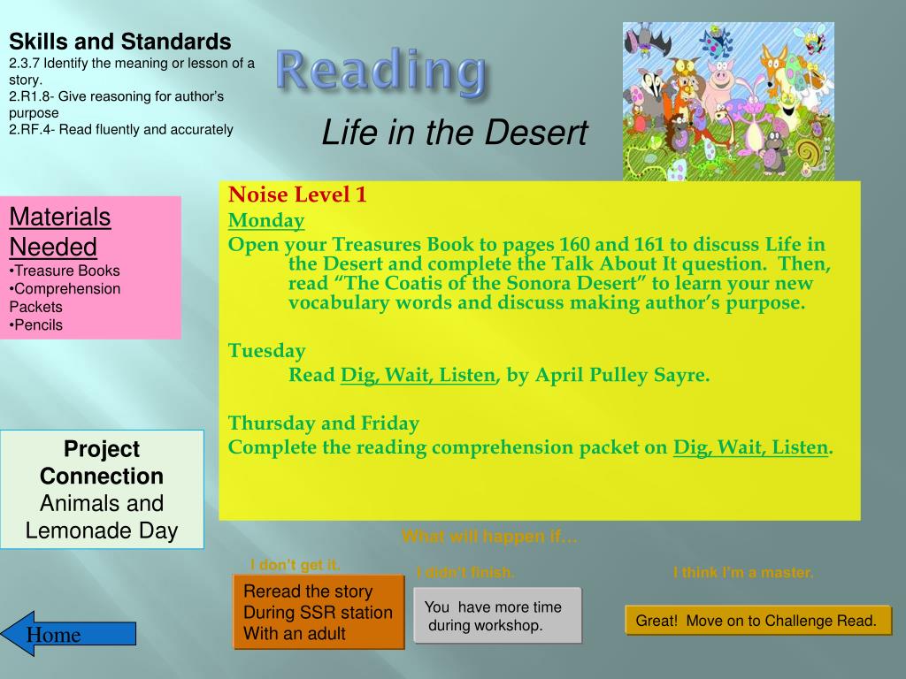 Skills and Standards 2.3.7 Identify the meaning or lesson of a story. 2.R1.8- Give reasoning for author’s purpose 2.RF.4- Read fluently and accurately Reading Life in the Desert Noise Level 1 Monday Open your Treasures Book to pages 160 and 161 to discuss Life in the Desert and complete the Talk About It question. Then, read “The Coatis of the Sonora Desert” to learn your new vocabulary words and discuss making author’s purpose. Tuesday Read Dig, Wait, Listen, by April Pulley Sayre. Thursday and Friday Complete the reading comprehension packet on Dig, Wait, Listen. • Materials Needed • Treasure Books • Comprehension Packets • Pencils Project Connection Animals and Lemonade Day What will happen if… I don’t get it. I didn’t finish. I think I’m a master. Reread the story During SSR station With an adult You have more time during workshop. Great! Move on to Challenge Read. Home