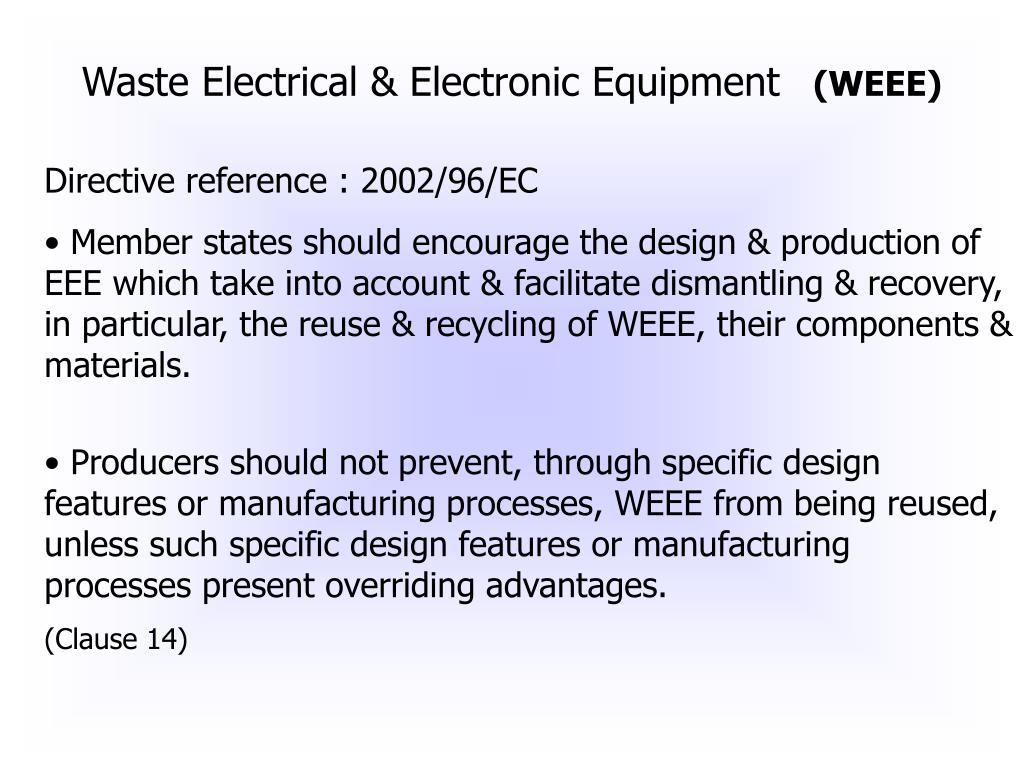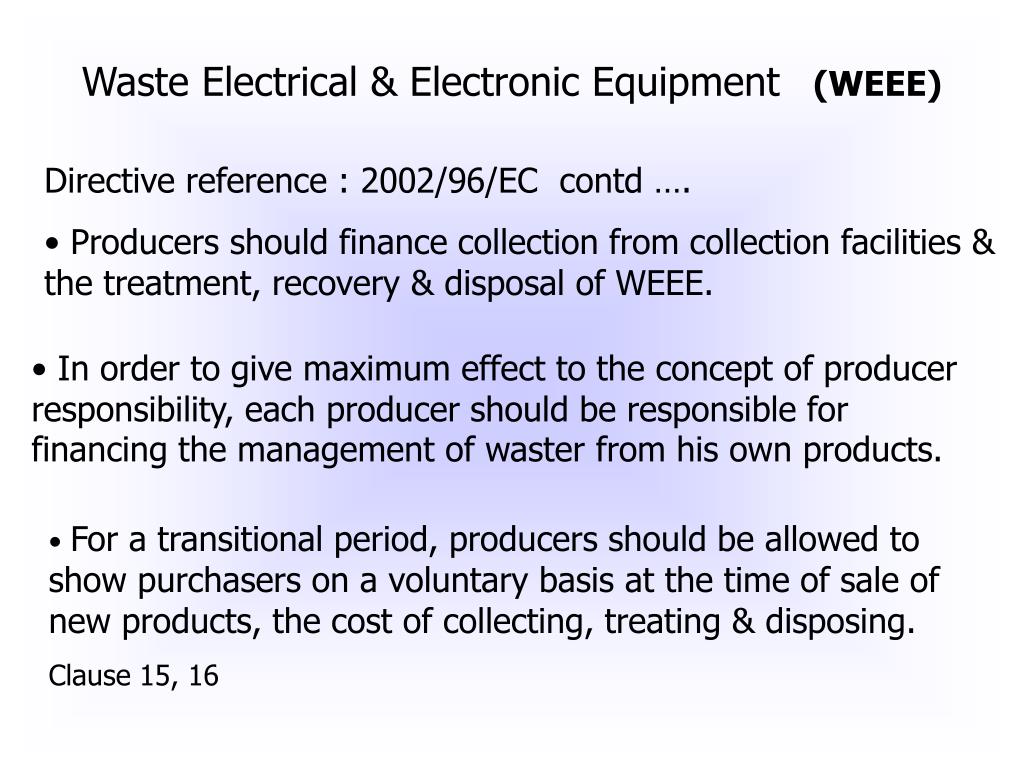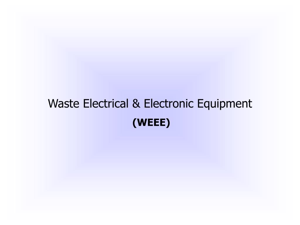 Waste Electrical & Electronic Equipment (WEEE). Waste Electrical and Electronic Equipment (WEEE) Directive Work started in the year 1994 To device a strategy for reducing the impact of electrical equipment on environment at end-of-life.