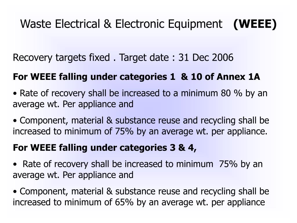 Waste Electrical & Electronic Equipment (WEEE) Recovery targets fixed . Target date : 31 Dec 2006 • For WEEE falling under categories 1 & 10 of Annex 1A • Rate of recovery shall be increased to a minimum 80 % by an average wt. Per appliance and • Component, material & substance reuse and recycling shall be increased to minimum of 75% by an average wt. per appliance. • For WEEE falling under categories 3 & 4, • Rate of recovery shall be increased to minimum 75% by an average wt. Per appliance and • Component, material & substance reuse and recycling shall be increased to minimum of 65% by an average wt. per appliance