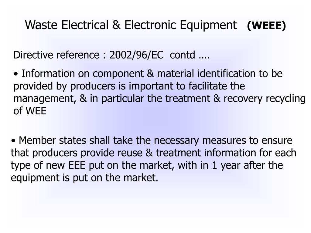 Waste Electrical & Electronic Equipment (WEEE) • Directive reference : 2002/96/EC contd …. • Information on component & material identification to be provided by producers is important to facilitate the management, & in particular the treatment & recovery recycling of WEE • Member states shall take the necessary measures to ensure that producers provide reuse & treatment information for each type of new EEE put on the market, with in 1 year after the equipment is put on the market.