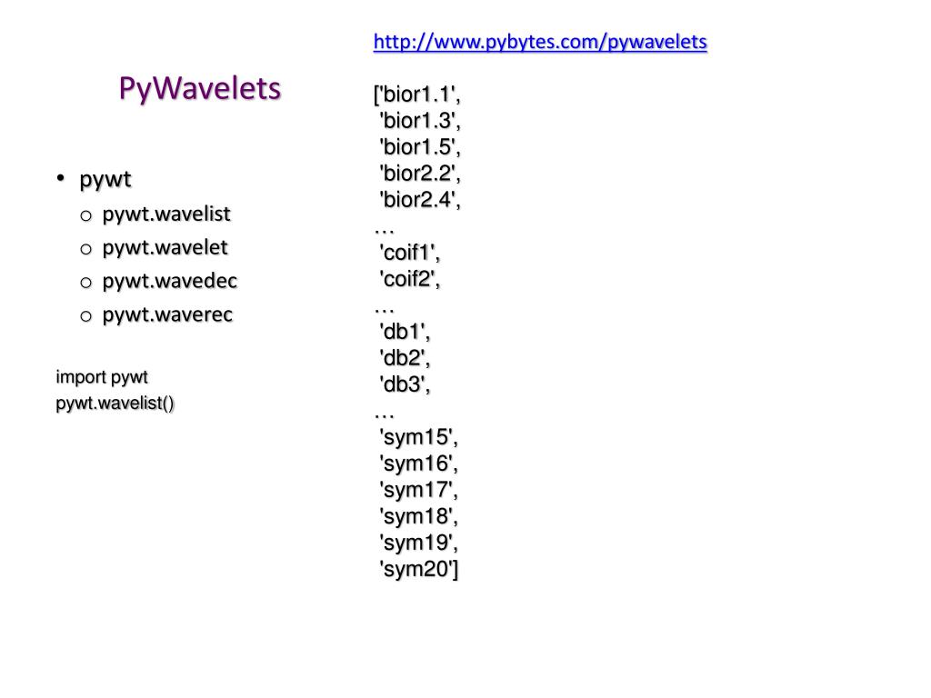 PyWavelets http://www.pybytes.com/pywavelets ['bior1.1', 'bior1.3', 'bior1.5', 'bior2.2', 'bior2.4', … 'coif1', 'coif2', … 'db1', 'db2', 'db3', … 'sym15', 'sym16', 'sym17', 'sym18', 'sym19', 'sym20'] • pywt • pywt.wavelist • pywt.wavelet • pywt.wavedec • pywt.waverec import pywt pywt.wavelist()