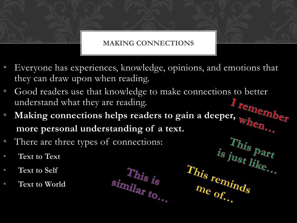 Making connections • Text-to-text connections are when readers are reminded of other things that they have read, other books by the same author, stories from a similar genre, or perhaps on the same topic. Readers gain insight during reading by thinking about how the information they are reading connects to other familiar text. • Example: This character has the same problem that I read about in a story last year! • TEXT – TO – TEXT • What does this remind me of in another book I’ve read? • How is this text similar to other things I’ve read? • How is this different from other books I’ve read? • Have I read about something like this before?