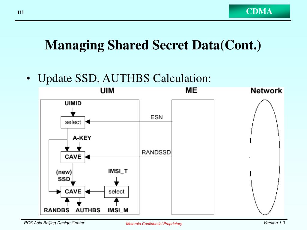 Shared Secret Data • SSD is a secret number that is semi-permanent. It is used in the calculation of authentication signatures, the Signaling Message Encryption Key (CMEA), and the Voice Privacy Mask (VPM)