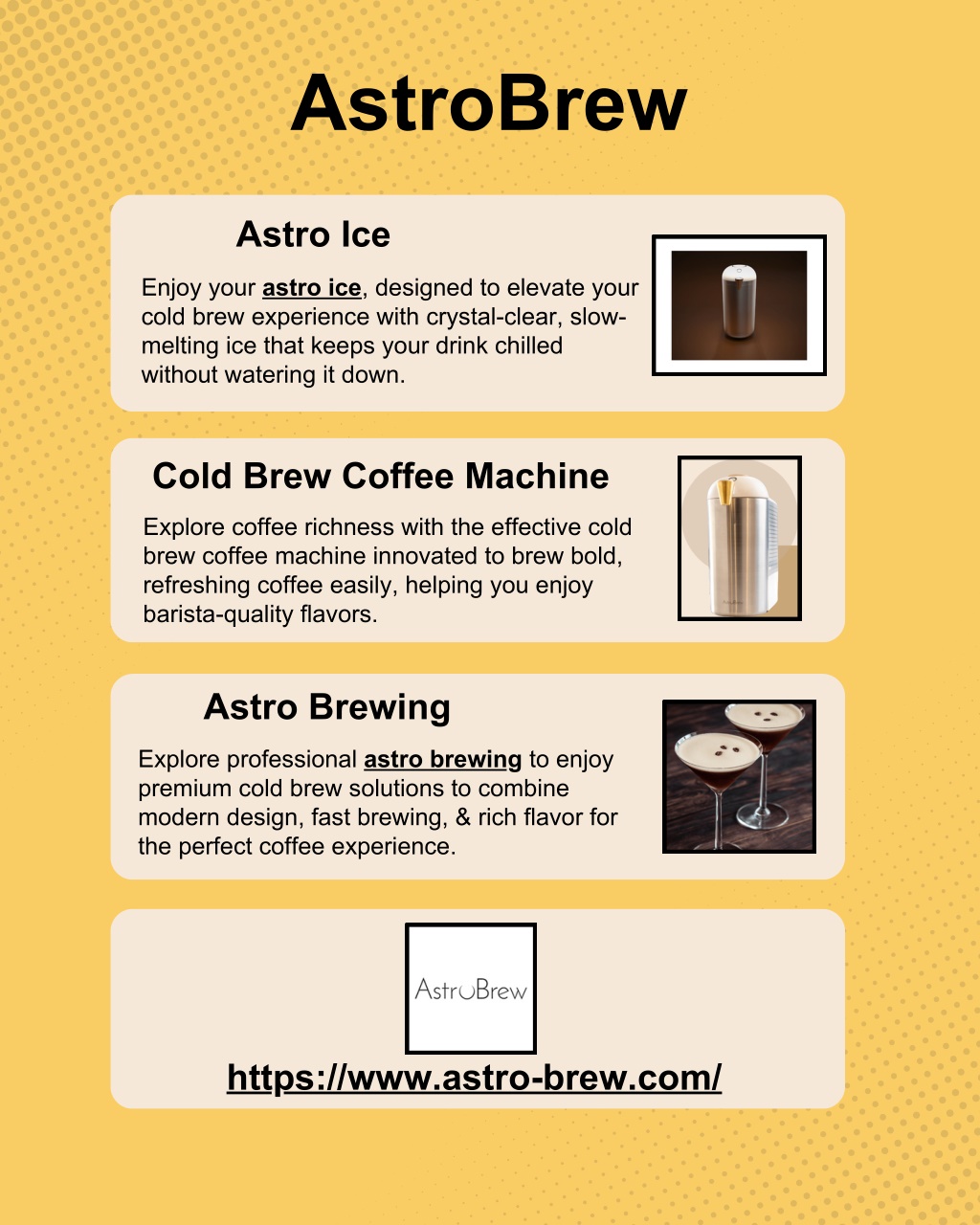AstroBrew Astro Ice Enjoy your astro ice, designed to elevate your cold brew experience with crystal-clear, slow- melting ice that keeps your drink chilled without watering it down. Cold Brew Coffee Machine Explore coffee richness with the effective cold brew coffee machine innovated to brew bold, refreshing coffee easily, helping you enjoy barista-quality flavors. Astro Brewing Explore professional astro brewing to enjoy premium cold brew solutions to combine modern design, fast brewing, & rich flavor for the perfect coffee experience. https://www.astro-brew.com/