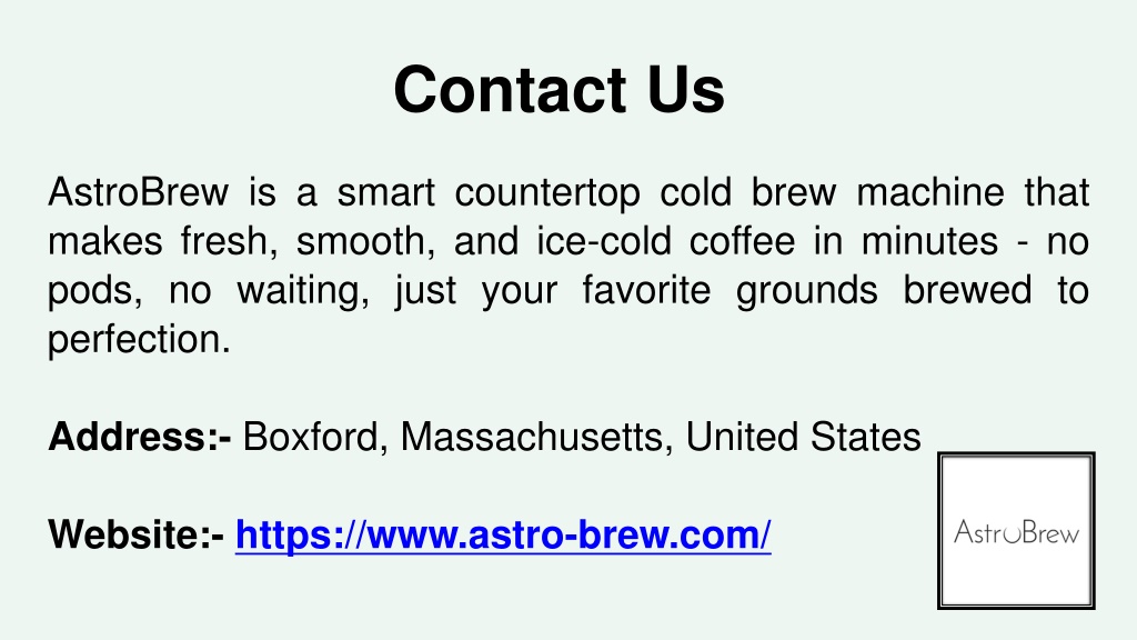 Contact Us AstroBrew is a smart countertop cold brew machine that makes fresh, smooth, and ice-cold coffee in minutes - no pods, no waiting, just your favorite grounds brewed to perfection. Address:-Boxford, Massachusetts, United States Website:-https://www.astro-brew.com/