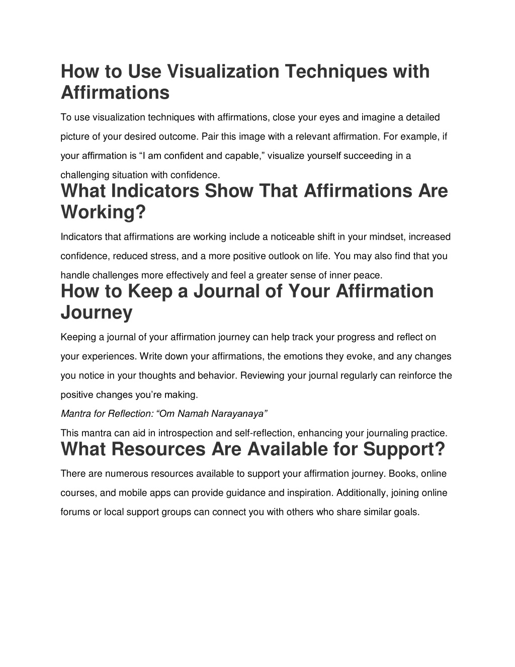 How to Use Visualization Techniques with Affirmations To use visualization techniques with affirmations, close your eyes and imagine a detailed picture of your desired outcome. Pair this image with a relevant affirmation. For example, if your affirmation is “I am confident and capable,” visualize yourself succeeding in a challenging situation with confidence. What Indicators Show That Affirmations Are Working? Indicators that affirmations are working include a noticeable shift in your mindset, increased confidence, reduced stress, and a more positive outlook on life. You may also find that you handle challenges more effectively and feel a greater sense of inner peace. How to Keep a Journal of Your Affirmation Journey Keeping a journal of your affirmation journey can help track your progress and reflect on your experiences. Write down your affirmations, the emotions they evoke, and any changes you notice in your thoughts and behavior. Reviewing your journal regularly can reinforce the positive changes you’re making. Mantra for Reflection: “Om Namah Narayanaya” This mantra can aid in introspection and self-reflection, enhancing your journaling practice. What Resources Are Available for Support? There are numerous resources available to support your affirmation journey. Books, online courses, and mobile apps can provide guidance and inspiration. Additionally, joining online forums or local support groups can connect you with others who share similar goals.