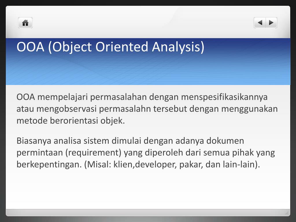 OOA (Object Oriented Analysis) OOA mempelajaripermasalahandenganmenspesifikasikannyaataumengobservasipermasalahntersebutdenganmenggunakanmetodeberorientasiobjek. Biasanyaanalisasistemdimulaidenganadanyadokumenpermintaan (requirement) yang diperolehdarisemuapihak yang berkepentingan. (Misal: klien,developer, pakar, dan lain-lain).