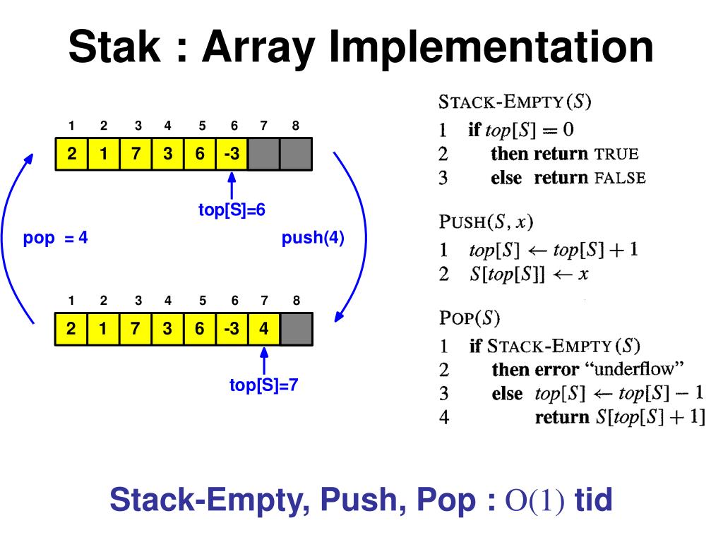 Stak : Array Implementation Stack-Empty, Push, Pop : O(1) tid