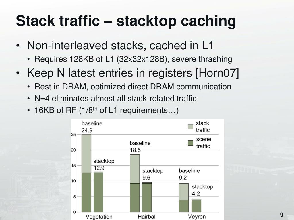 Stack traffic – stacktop caching • Non-interleaved stacks, cached in L1 • Requires 128KB of L1 (32x32x128B), severe thrashing • Keep N latest entries in registers [Horn07] • Rest in DRAM, optimized direct DRAM communication • N=4 eliminates almost all stack-related traffic • 16KB of RF (1/8th of L1 requirements…)