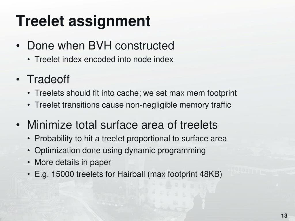 Treelet assignment • Done when BVH constructed • Treelet index encoded into node index • Tradeoff • Treelets should fit into cache; we set max mem footprint • Treelet transitions cause non-negligible memory traffic • Minimize total surface area of treelets • Probability to hit a treelet proportional to surface area • Optimization done using dynamic programming • More details in paper • E.g. 15000 treelets for Hairball (max footprint 48KB)