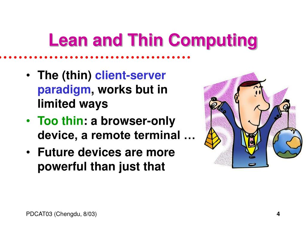 Lean and Thin Computing • The (thin) client-server paradigm, works but in limited ways • Too thin: a browser-only device, a remote terminal … • Future devices are more powerful than just that