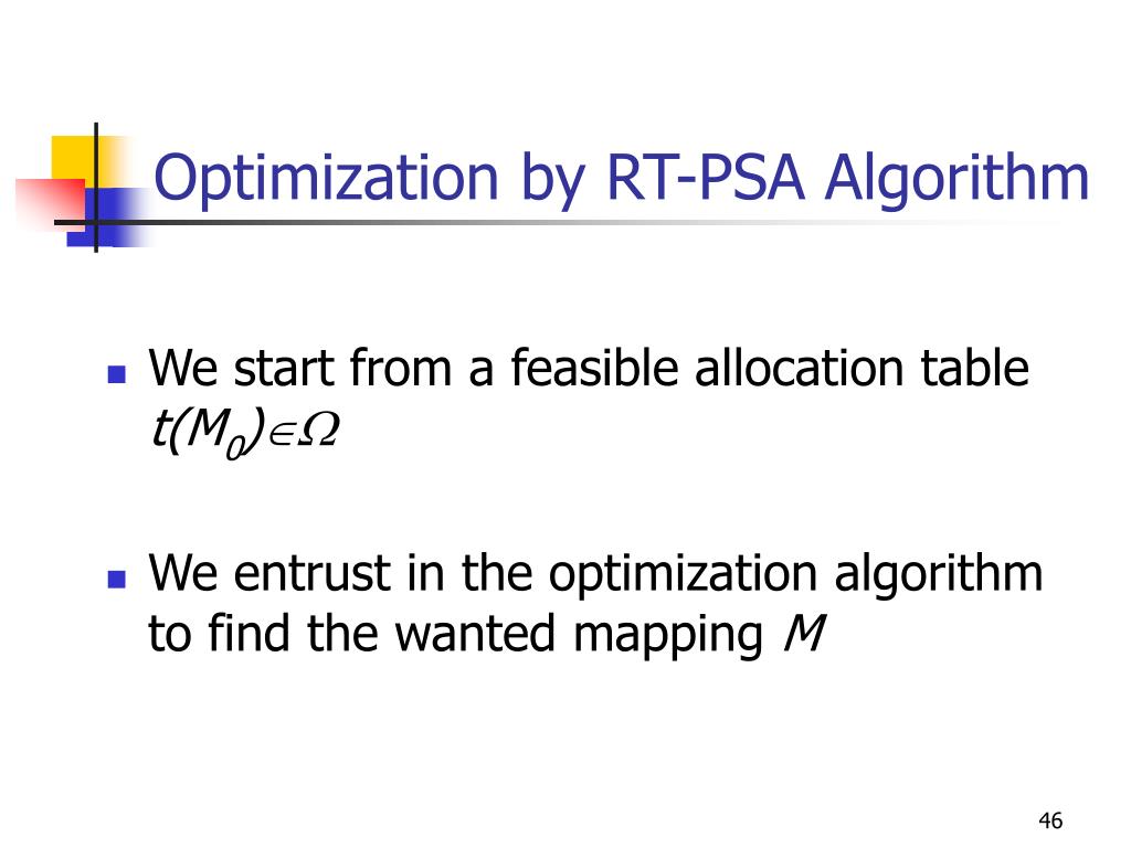 Optimization by RT-PSA Algorithm • We start from a feasible allocation table t(M0)W • We entrust in the optimization algorithm to find the wanted mapping M