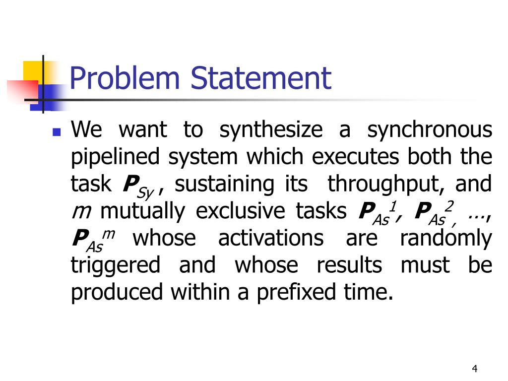 Problem Statement • We want to synthesize a synchronous pipelined system which executes both the task PSy , sustaining its throughput, and m mutually exclusive tasks PAs1, PAs2, …, PAsm whose activations are randomly triggered and whose results must be produced within a prefixed time.