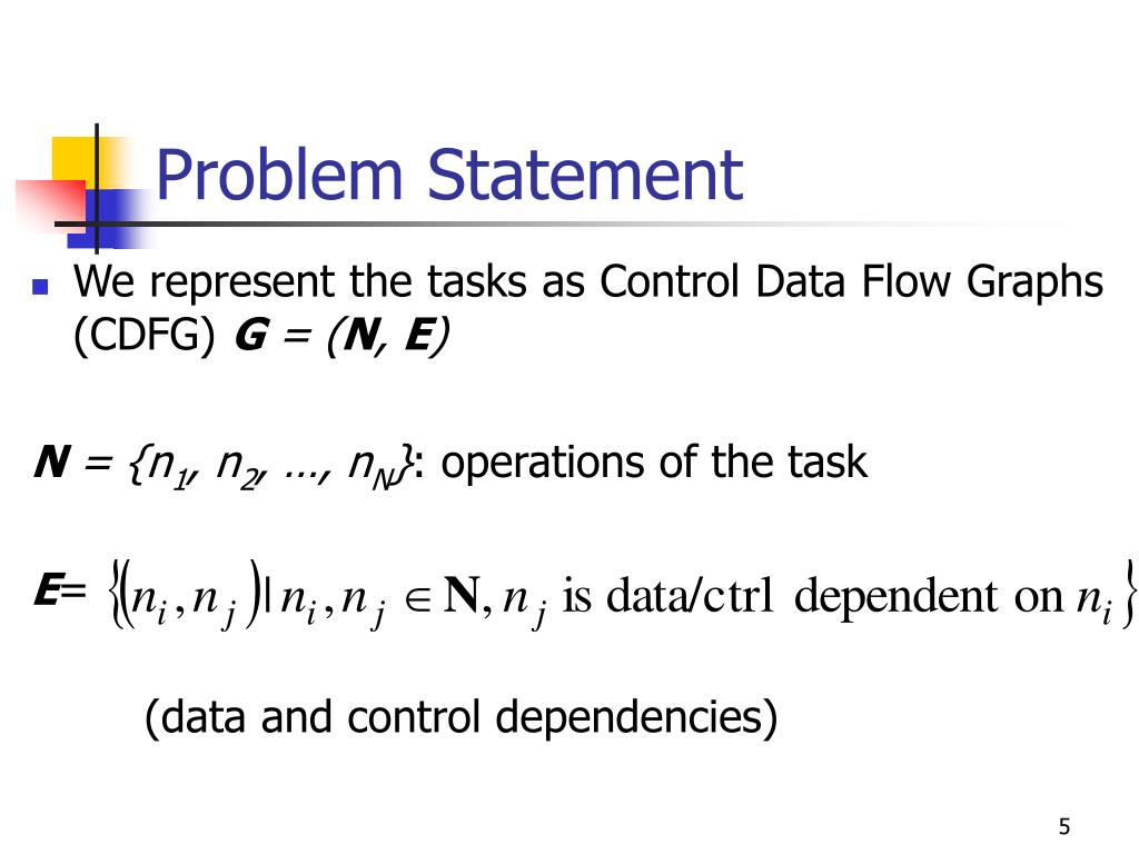 Problem Statement • We represent the tasks as Control Data Flow Graphs (CDFG) G = (N, E) N = {n1, n2, …, nN}: operations of the task E= (data and control dependencies)