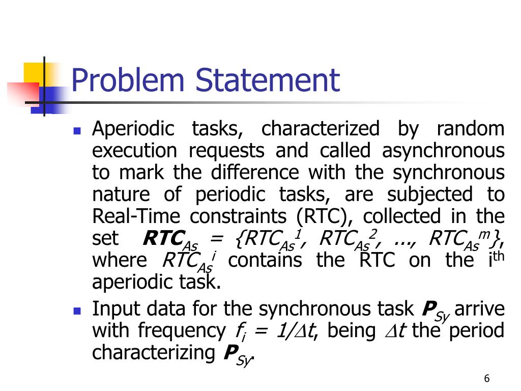 Problem Statement • Aperiodic tasks, characterized by random execution requests and called asynchronous to mark the difference with the synchronous nature of periodic tasks, are subjected to Real-Time constraints (RTC), collected in the set RTCAs = {RTCAs1, RTCAs2, ..., RTCAsm}, where RTCAsi contains the RTC on the ith aperiodic task. • Input data for the synchronous task PSy arrive with frequency fi = 1/Dt, being Dt the period characterizing PSy.