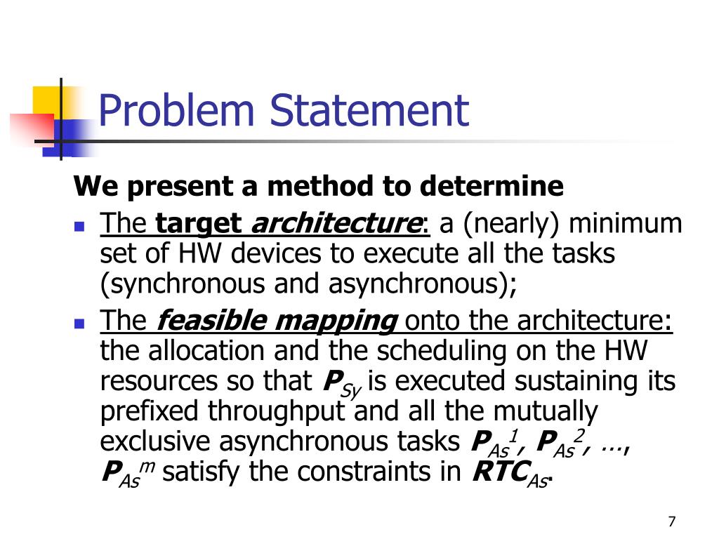 Problem Statement We present a method to determine • The target architecture: a (nearly) minimum set of HW devices to execute all the tasks (synchronous and asynchronous); • The feasible mappingonto the architecture: the allocation and the scheduling on the HW resources so that PSyis executed sustaining its prefixed throughput and all the mutually exclusive asynchronous tasks PAs1, PAs2, …, PAsmsatisfy the constraints in RTCAs.