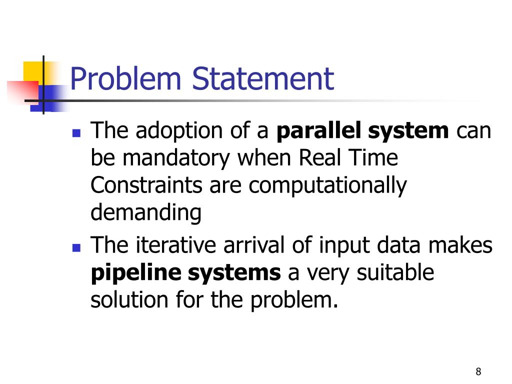 Problem Statement • The adoption of a parallel system can be mandatory when Real Time Constraints are computationally demanding • The iterative arrival of input data makes pipeline systems a very suitable solution for the problem.