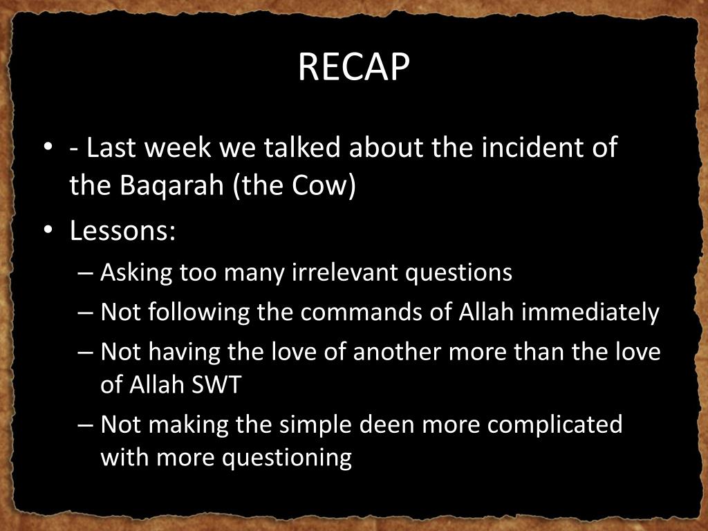RECAP • - Last week we talked about the incident of the Baqarah (the Cow) • Lessons: • Asking too many irrelevant questions • Not following the commands of Allah immediately • Not having the love of another more than the love of Allah SWT • Not making the simple deen more complicated with more questioning