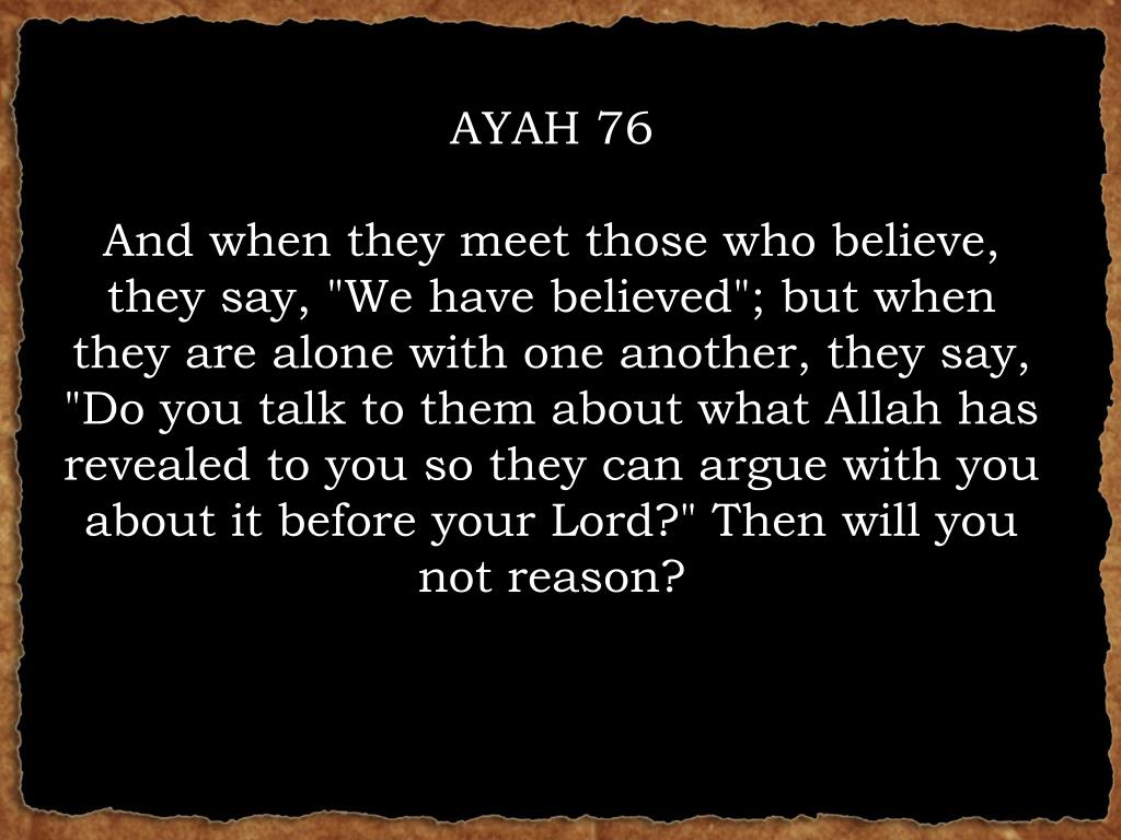 AYAH 76 And when they meet those who believe, they say, "We have believed"; but when they are alone with one another, they say, "Do you talk to them about what Allah has revealed to you so they can argue with you about it before your Lord?" Then will you not reason?