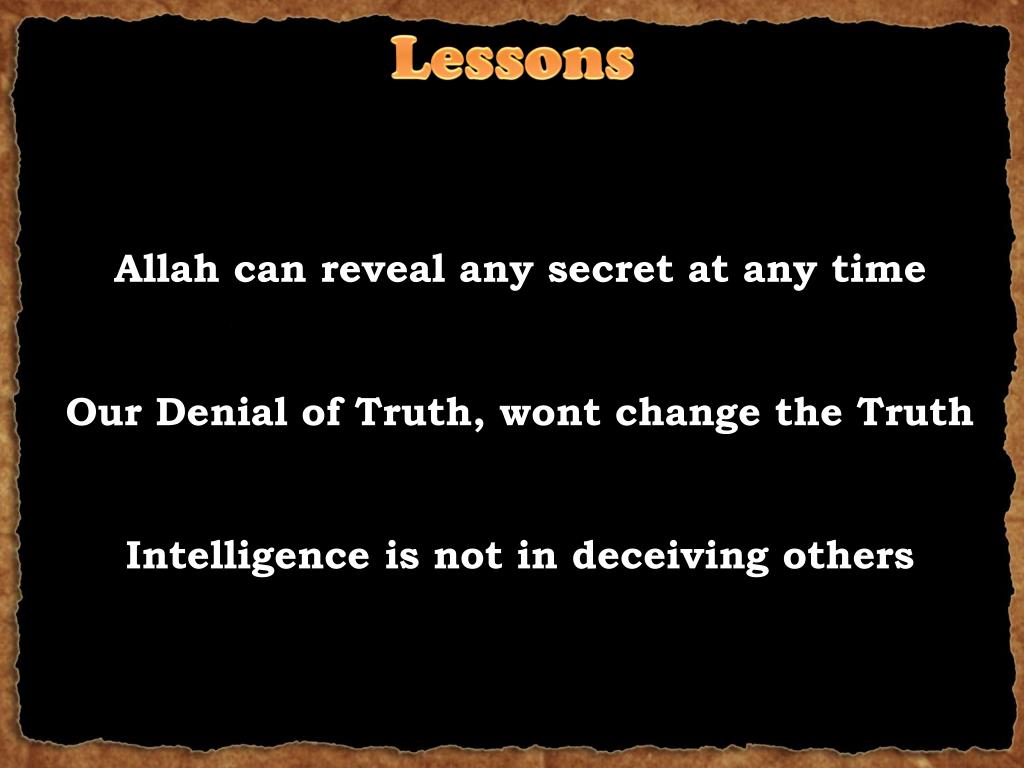 Lessons Allah can reveal any secret at any time Our Denial of Truth, wont change the Truth Intelligence is not in deceiving others