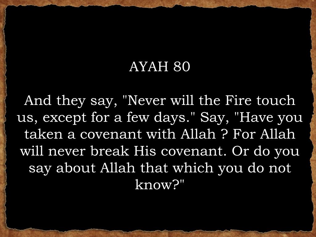 AYAH 80 And they say, "Never will the Fire touch us, except for a few days." Say, "Have you taken a covenant with Allah ? For Allah will never break His covenant. Or do you say about Allah that which you do not know?"