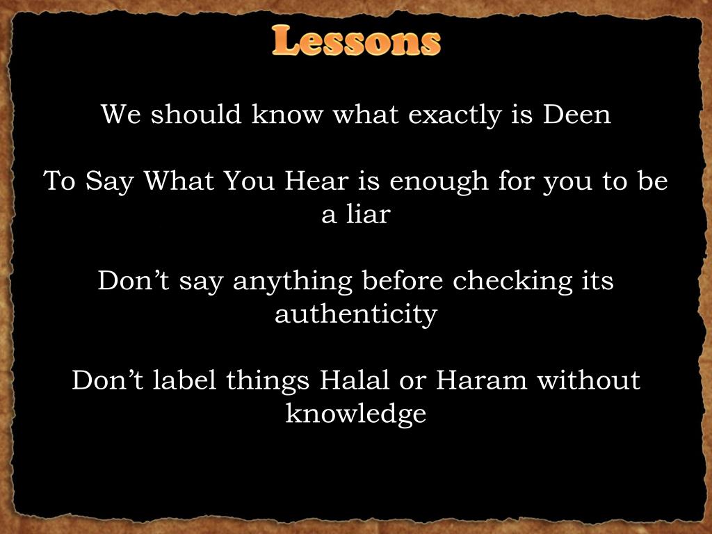 Lessons We should know what exactly is Deen To Say What You Hear is enough for you to be a liar Don’t say anything before checking its authenticity Don’t label things Halal or Haram without knowledge