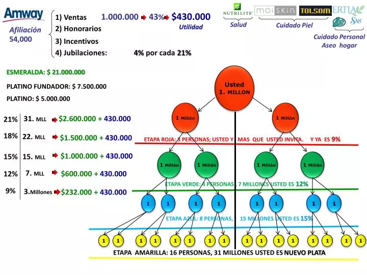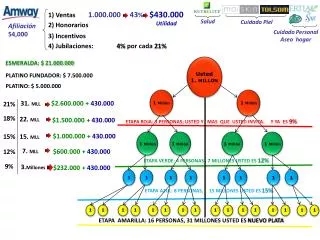 $430.000 Utilidad 1.000.000 43% 1) Ventas 2) Honorarios Afiliación Salud Cuidado Piel 54,000 3) Incentivos Cuidado Personal Aseo hogar 4) Jubilaciones: 4% por cada 21% Usted 1. MILLON ESMERALDA: $ 21.000.000 PLATINO FUNDADOR: $ 7.500.000 PLATINO: $ 5.000.000 21% 18% ETAPA ROJA: 3 PERSONAS; USTED Y MAS QUE USTED INVITA. Y YA ES 9% 12% 15% 1 Millón 1 1 Millón 1 1 1 1 1 1 1 1 1 1 1 1 1 Millón 1 1 1 1 1 1 1 1 1 1 1 1 Millón $2.600.000 + 430.000 31. MLL 1 Millón 1 Millón ETAPA VERDE: 4 PERSONAS , 7 MILLONES USTED ES 12% 22. MLL $1.500.000 + 430.000 $1.000.000 + 430.000 15. MLL ETAPA AZUL: 8 PERSONAS, 15 MILLONES USTED ES 15% 9% 7. MLL $600.000 + 430.000 3.Millones $232.000 + 430.000 ETAPA AMARILLA: 16 PERSONAS, 31 MILLONES USTED ES NUEVO PLATA