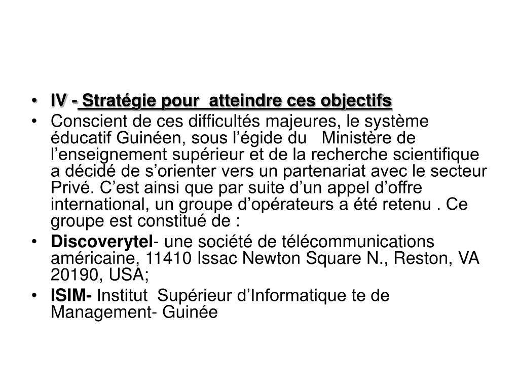 IV - Stratégie pour atteindre ces objectifs • Conscient de ces difficultés majeures, le système éducatif Guinéen, sous l’égide du Ministère de l’enseignement supérieur et de la recherche scientifique a décidé de s’orienter vers un partenariat avec le secteur Privé. C’est ainsi que par suite d’un appel d’offre international, un groupe d’opérateurs a été retenu . Ce groupe est constitué de : • Discoverytel- une société de télécommunications américaine, 11410 Issac Newton Square N., Reston, VA 20190, USA; • ISIM- Institut Supérieur d’Informatique te de Management- Guinée