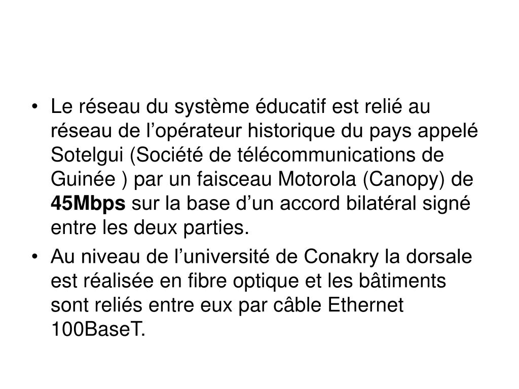 Le réseau du système éducatif est relié au réseau de l’opérateur historique du pays appelé Sotelgui (Société de télécommunications de Guinée ) par un faisceau Motorola (Canopy) de 45Mbps sur la base d’un accord bilatéral signé entre les deux parties. • Au niveau de l’université de Conakry la dorsale est réalisée en fibre optique et les bâtiments sont reliés entre eux par câble Ethernet 100BaseT.