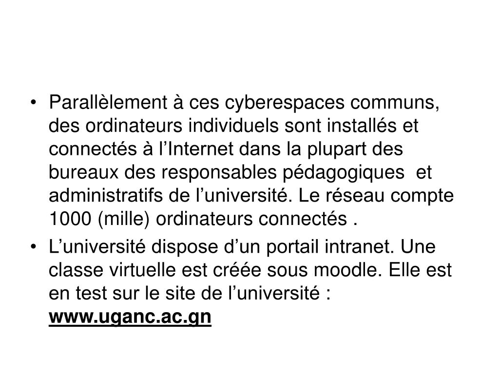 Parallèlement à ces cyberespaces communs, des ordinateurs individuels sont installés et connectés à l’Internet dans la plupart des bureaux des responsables pédagogiques et administratifs de l’université. Le réseau compte 1000 (mille) ordinateurs connectés . • L’université dispose d’un portail intranet. Une classe virtuelle est créée sous moodle. Elle est en test sur le site de l’université : www.uganc.ac.gn