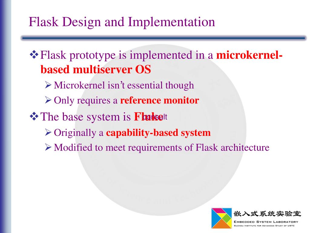 Flask Design and Implementation • Flask prototype is implemented in a microkernel-based multiserver OS • Microkernel isn’t essential though • Only requires a reference monitor • The base system is Fluke • Originally a capability-based system • Modified to meet requirements of Flask architecture consult