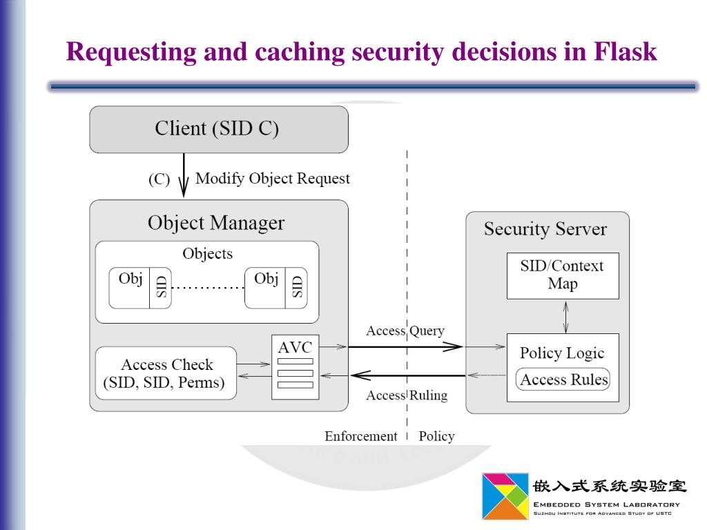 Flask provides three primary elements for object managers: • Interfaces for accessing security server decisions • Access – permission between two entities • Labeling – specify security attributes of an object • Polyinstantiation – which member of a set of resources should be accessed for a particular request • Access vector cache (AVC) to cache decisions and minimize performance overhead • Registration service to receive notifications when policy changes