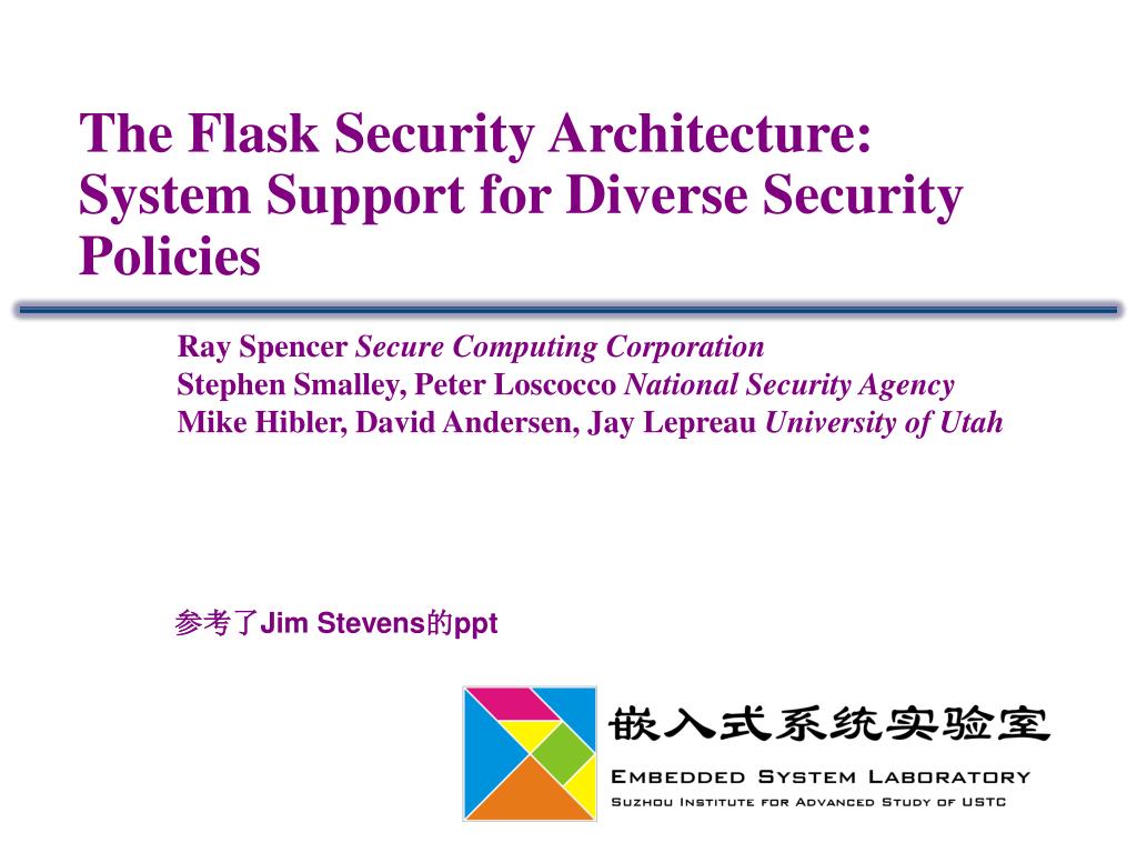 The Flask Security Architecture: System Support for Diverse Security Policies Ray Spencer Secure Computing Corporation Stephen Smalley, Peter Loscocco National Security Agency Mike Hibler, David Andersen, Jay Lepreau University of Utah 参考了Jim Stevens的ppt