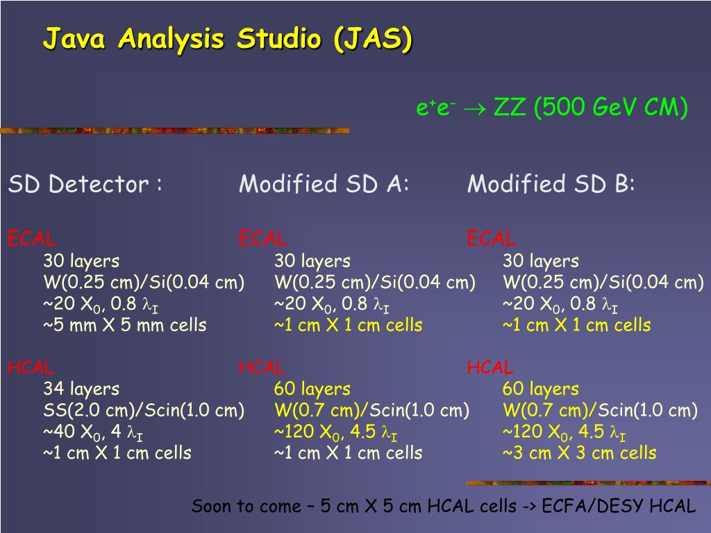 Java Analysis Studio (JAS) e+e- ZZ (500 GeV CM) • SD Detector : • ECAL • 30 layers • W(0.25 cm)/Si(0.04 cm) • ~20 X0, 0.8 I • ~5 mm X 5 mm cells • HCAL • 34 layers • SS(2.0 cm)/Scin(1.0 cm) • ~40 X0, 4 I • ~1 cm X 1 cm cells • Modified SD A: • ECAL • 30 layers • W(0.25 cm)/Si(0.04 cm) • ~20 X0, 0.8 I • ~1 cm X 1 cm cells • HCAL • 60 layers • W(0.7 cm)/Scin(1.0 cm) • ~120 X0, 4.5 I • ~1 cm X 1 cm cells • Modified SD B: • ECAL • 30 layers • W(0.25 cm)/Si(0.04 cm) • ~20 X0, 0.8 I • ~1 cm X 1 cm cells • HCAL • 60 layers • W(0.7 cm)/Scin(1.0 cm) • ~120 X0, 4.5 I • ~3 cm X 3 cm cells Soon to come – 5 cm X 5 cm HCAL cells -> ECFA/DESY HCAL