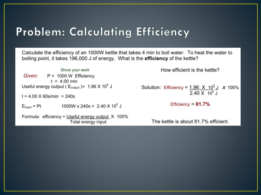 Calculating Efficiency The efficiency of a device is the ratio of the useful energy that comes out of a device to the total energy that went in. The more input energy converted to output energy, the more efficient the device is.