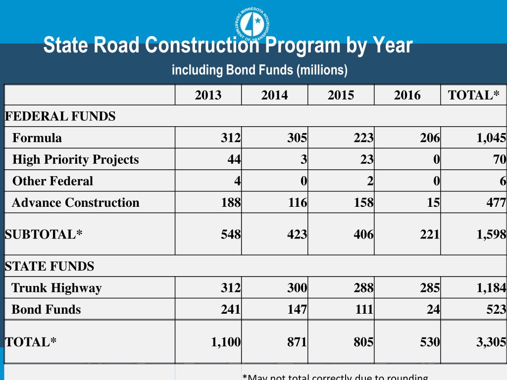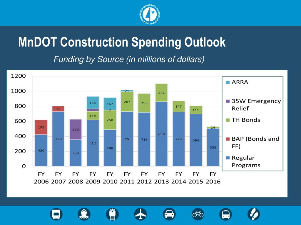 MnDOT Construction Spending Outlook . Funding by Source (in millions of dollars). State Road Construction Program by Year including Bond Funds (millions).