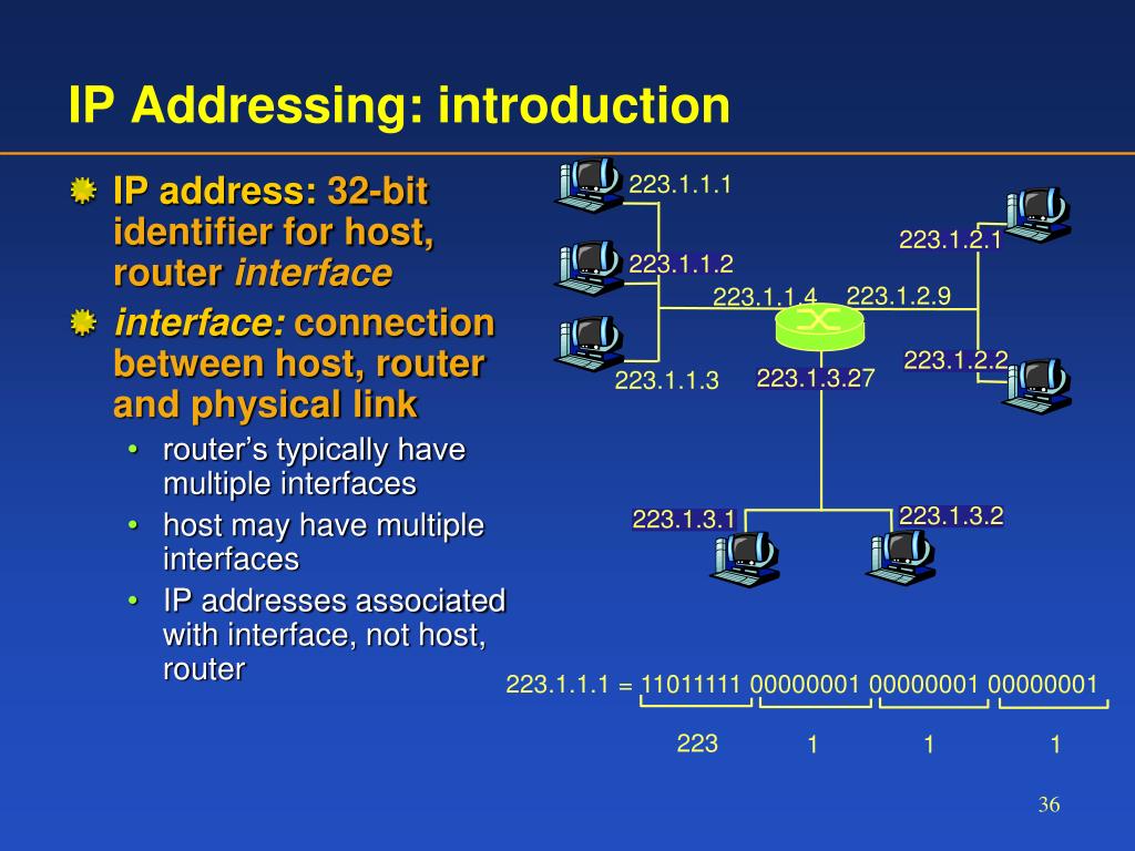 IP address: 32-bit identifier for host, router interface interface: connection between host, router and physical link router’s typically have multiple interfaces host may have multiple interfaces IP addresses associated with interface, not host, router 223.1.1.2 223.1.2.1 223.1.3.27 223.1.3.1 223.1.3.2 223.1.2.2 IP Addressing: introduction 223.1.1.1 223.1.2.9 223.1.1.4 223.1.1.3 223.1.1.1 = 11011111 00000001 00000001 00000001 223 1 1 1