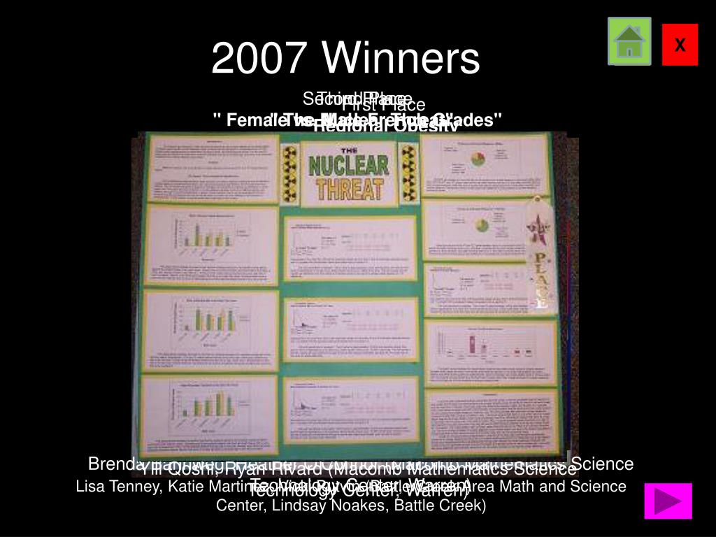 Second Place" Female vs. Male French Grades" Third Place" The Nuclear Threat" First Place" Regional Obesity" YlliQoshi, Ryan Rivard (Macomb Mathematics Science Technology Center, Warren) BrendaBahnweg, Heather O'Connor (Macomb Mathematics Science Technology Center, Warren) Lisa Tenney, Katie Martinez, Vicki Putvin (Battle Creek Area Math and Science Center, Lindsay Noakes, Battle Creek) 2007 Winners