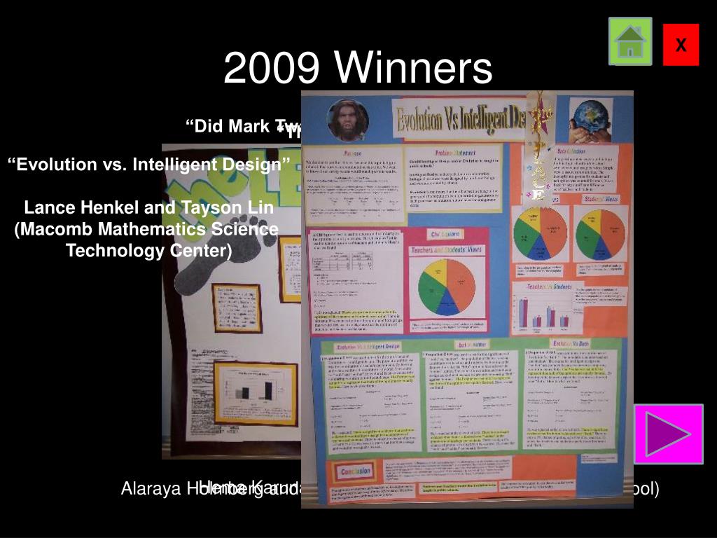 1st Place “Did Mark Twain Really Know English?” 2nd Place “The Lead Foot” “Evolution vs. Intelligent Design” Lance Henkel and Tayson Lin (Macomb Mathematics Science Technology Center) Hema Karunakaram (Saline High School) Alaraya Holmberg and Miranda Rohrbough (Montague High School) 2009 Winners