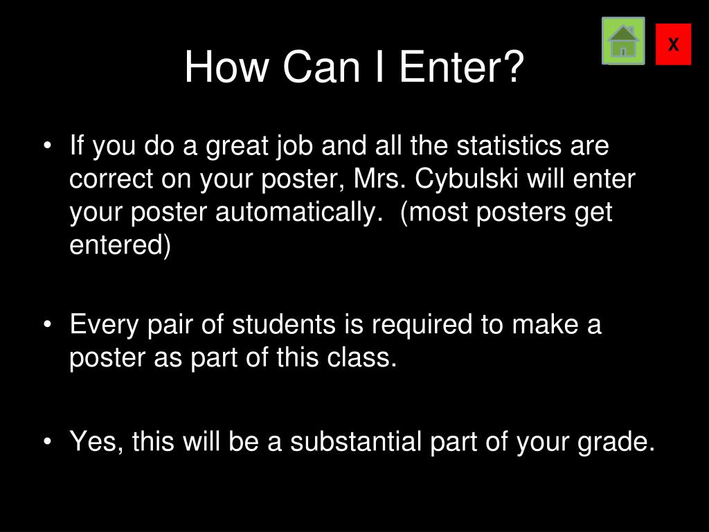 How Can I Enter? • If you do a great job and all the statistics are correct on your poster, Mrs. Cybulski will enter your poster automatically. (most posters get entered) • Every pair of students is required to make a poster as part of this class. • Yes, this will be a substantial part of your grade.
