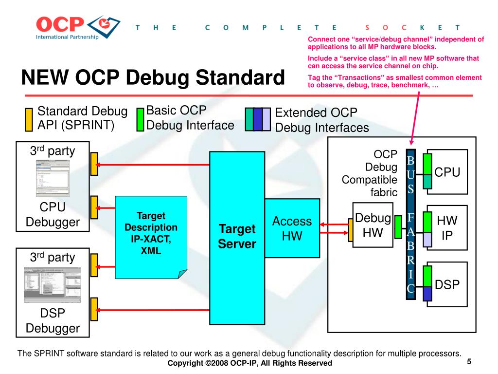 OCP Debug Socket for Multi-Core Debugging OCP-IP announces the release of its Debug Standard. The new standard identifies Basic and Extended sets of socket level signals for debugging of multiple processor cores connected with the OCP interface. The standard represents a breakthrough allowing designers to distribute debug signals as part of the system interface scheme; rather than wired separately from the data path as had been previously been the case. This innovative new approach greatly enhances system providers ability to prepare multi-core debug hardware and software.