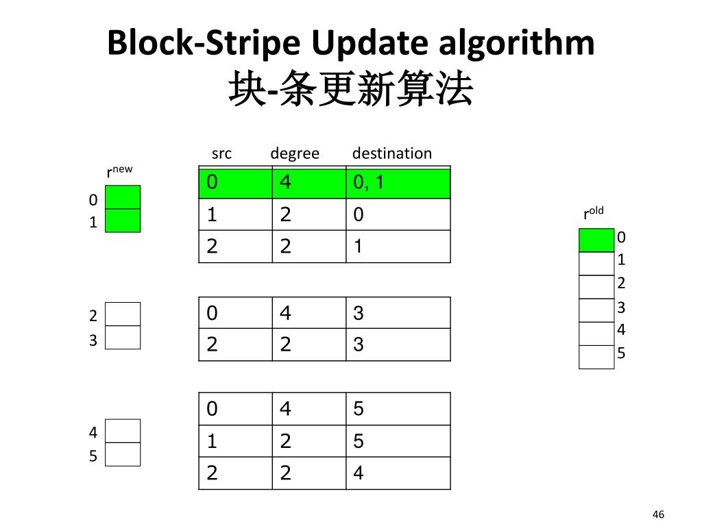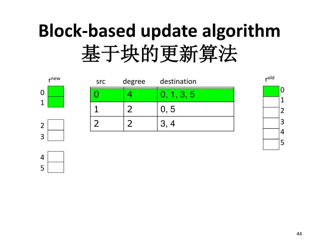 Block-based update algorithm基于块的更新算法 rold rnew src degree destination 0 0 1 1 2 3 2 4 3 5 4 5