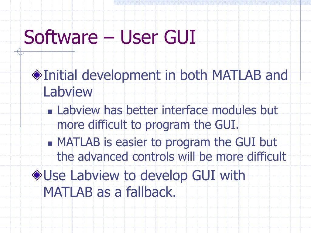 Software – User GUI • Initial development in both MATLAB and Labview • Labview has better interface modules but more difficult to program the GUI. • MATLAB is easier to program the GUI but the advanced controls will be more difficult • Use Labview to develop GUI with MATLAB as a fallback.