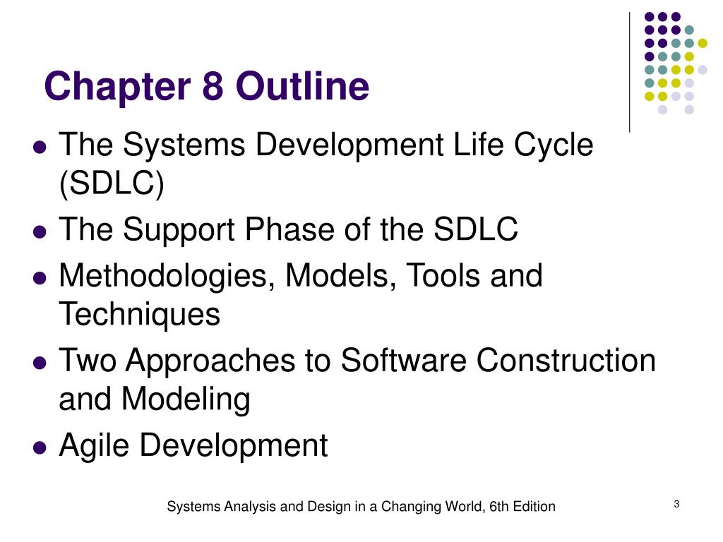 Chapter 8 Outline • The Systems Development Life Cycle (SDLC) • The Support Phase of the SDLC • Methodologies, Models, Tools and Techniques • Two Approaches to Software Construction and Modeling • Agile Development Systems Analysis and Design in a Changing World, 6th Edition