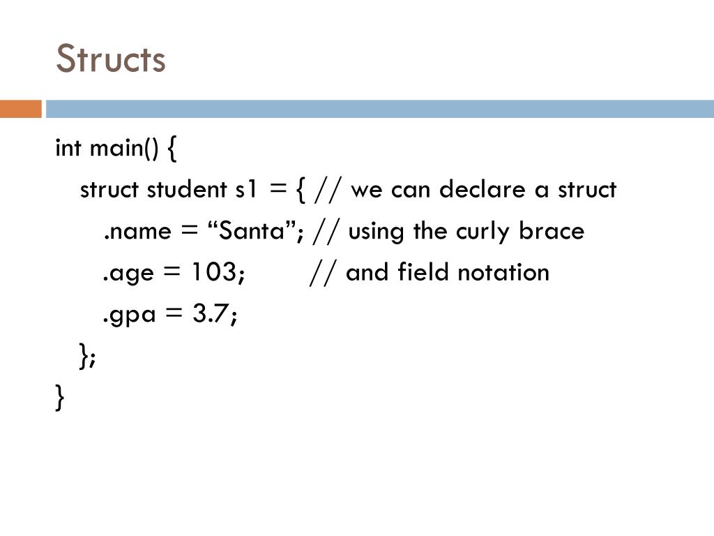 Structs int main() { struct student s1 = { // we can declare a struct .name = “Santa”; // using the curly brace .age = 103; // and field notation .gpa = 3.7; }; }