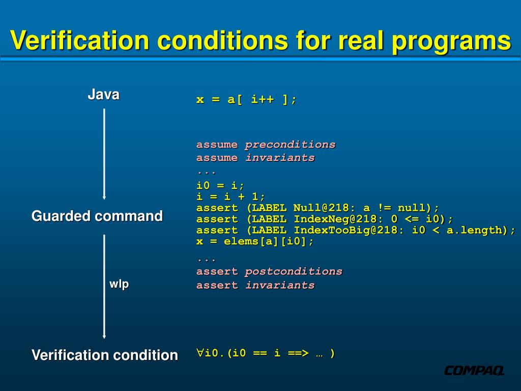 Verification conditions for real programs Java x = a[ i++ ]; assume preconditions assume invariants ... ... assert postconditions assert invariants i0 = i;i = i + 1;assert (LABEL Null@218: a != null);assert (LABEL IndexNeg@218: 0 <= i0);assert (LABEL IndexTooBig@218: i0 < a.length);x = elems[a][i0]; Guarded command wlp Verification condition i0.(i0 == i ==> … )