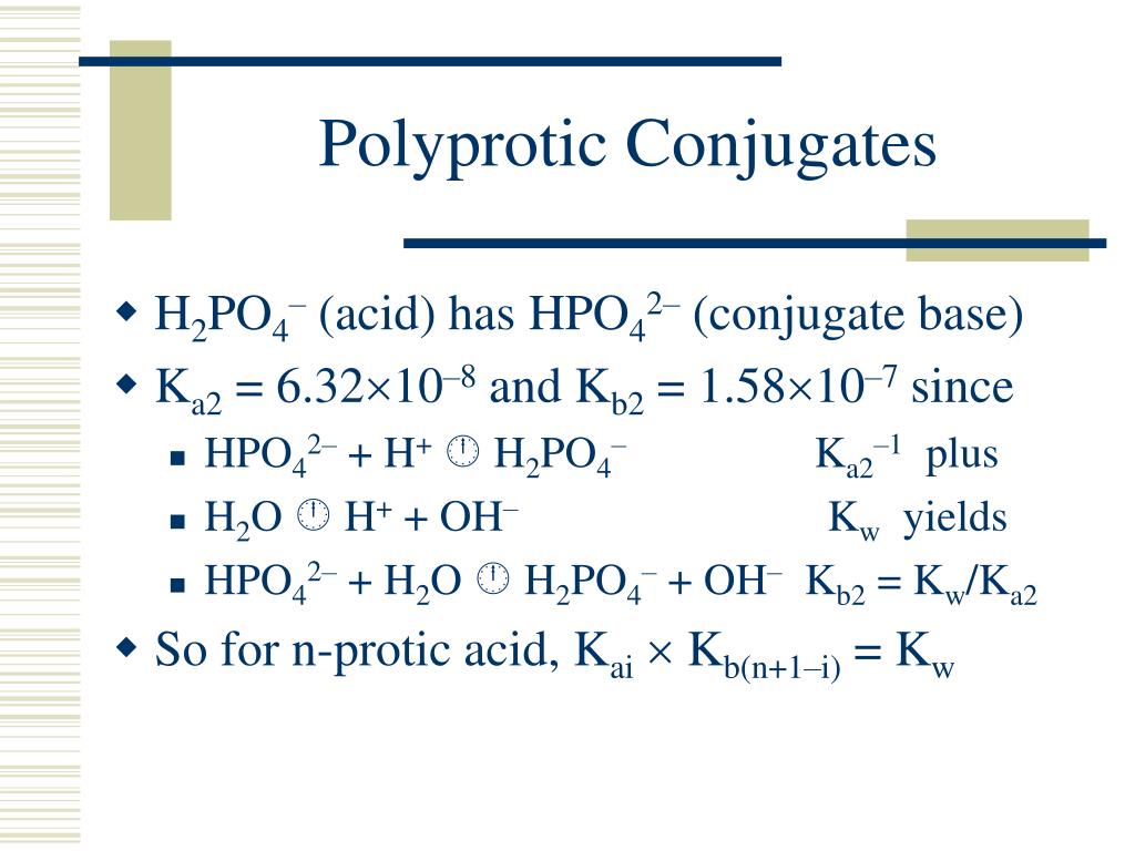 Polyprotic Conjugates • H2PO4– (acid) has HPO42– (conjugate base) • Ka2 = 6.3210–8 and Kb2 = 1.5810–7 since • HPO42–+ H+ H2PO4–Ka2–1 plus • H2O H+ + OH– Kw yields • HPO42–+ H2O H2PO4–+ OH– Kb2 = Kw/Ka2 • So for n-protic acid, Kai Kb(n+1–i) = Kw